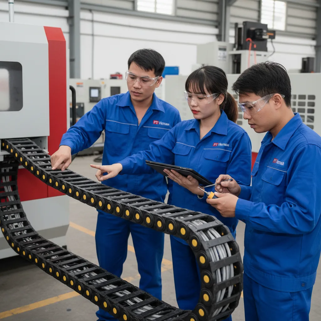 Công ty PT Việt Nam được thành lập với mục tiêu cung cấp các sản phẩm xích nhựa dẫn cáp chất lượng cao cho thị trường nội địa và quốc tế. Với hơn 15 năm kinh nghiệm trong ngành, chúng tôi đã xây dựng một đội ngũ nhân viên chuyên nghiệp và sáng tạo, nỗ lực không ngừng để phát triển và cải tiến sản phẩm. Hiện tại, chúng tôi tự hào sở hữu nhiều mẫu mã xích nhựa đa dạng, đáp ứng nhu cầu của các lĩnh vực điện, viễn thông và công nghiệp. Tôn chỉ của chúng tôi là “Chất lượng là uy tín”, cam kết mang đến sản phẩm bền bỉ, an toàn và dịch vụ khách hàng tận tâm, đồng hành cùng sự phát triển bền vững của khách hàng và xã hội.