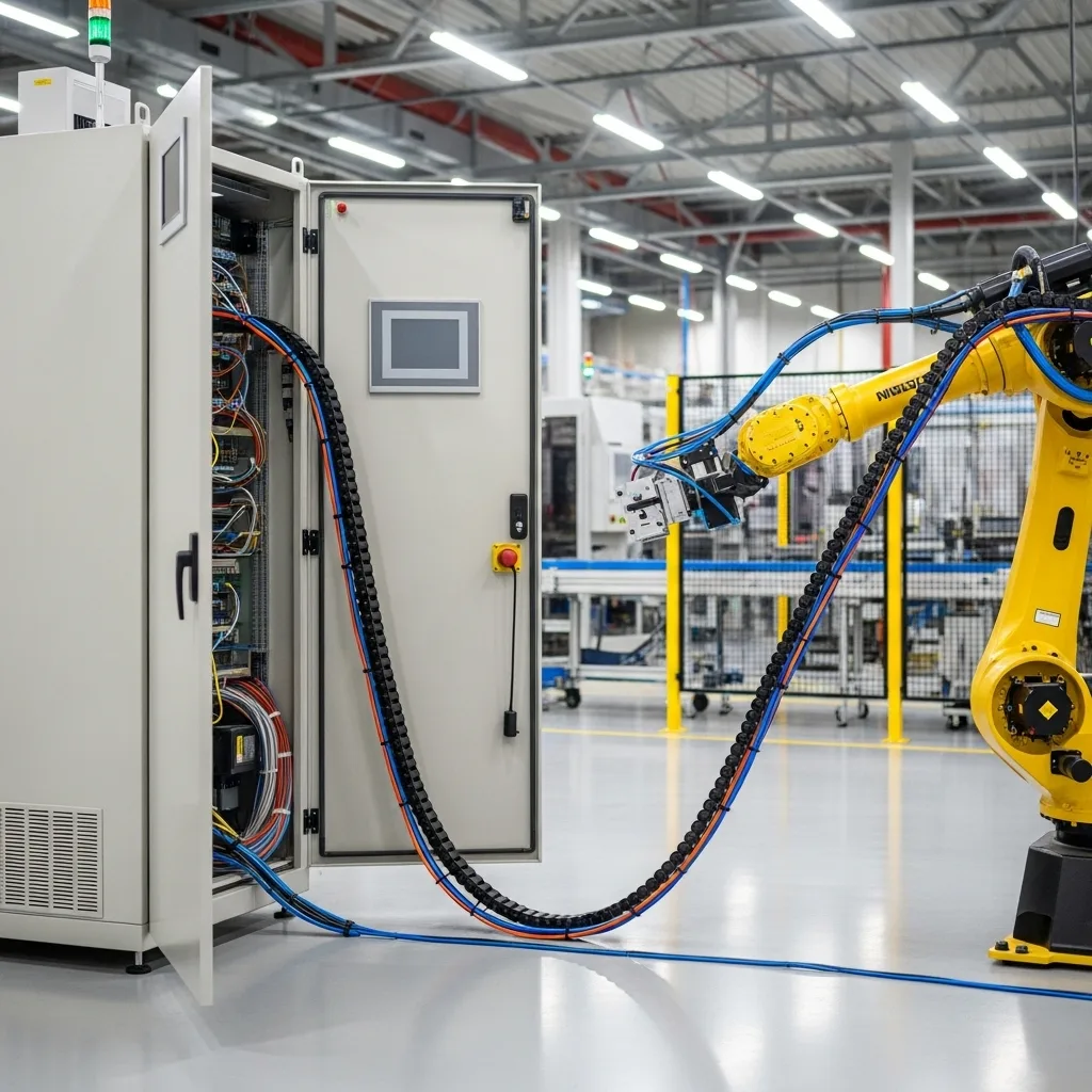 Ứng dụng xích cáp trong hệ thống dây điện kết nối từ tủ điều khiển đến thiết bị sản xuất tự động