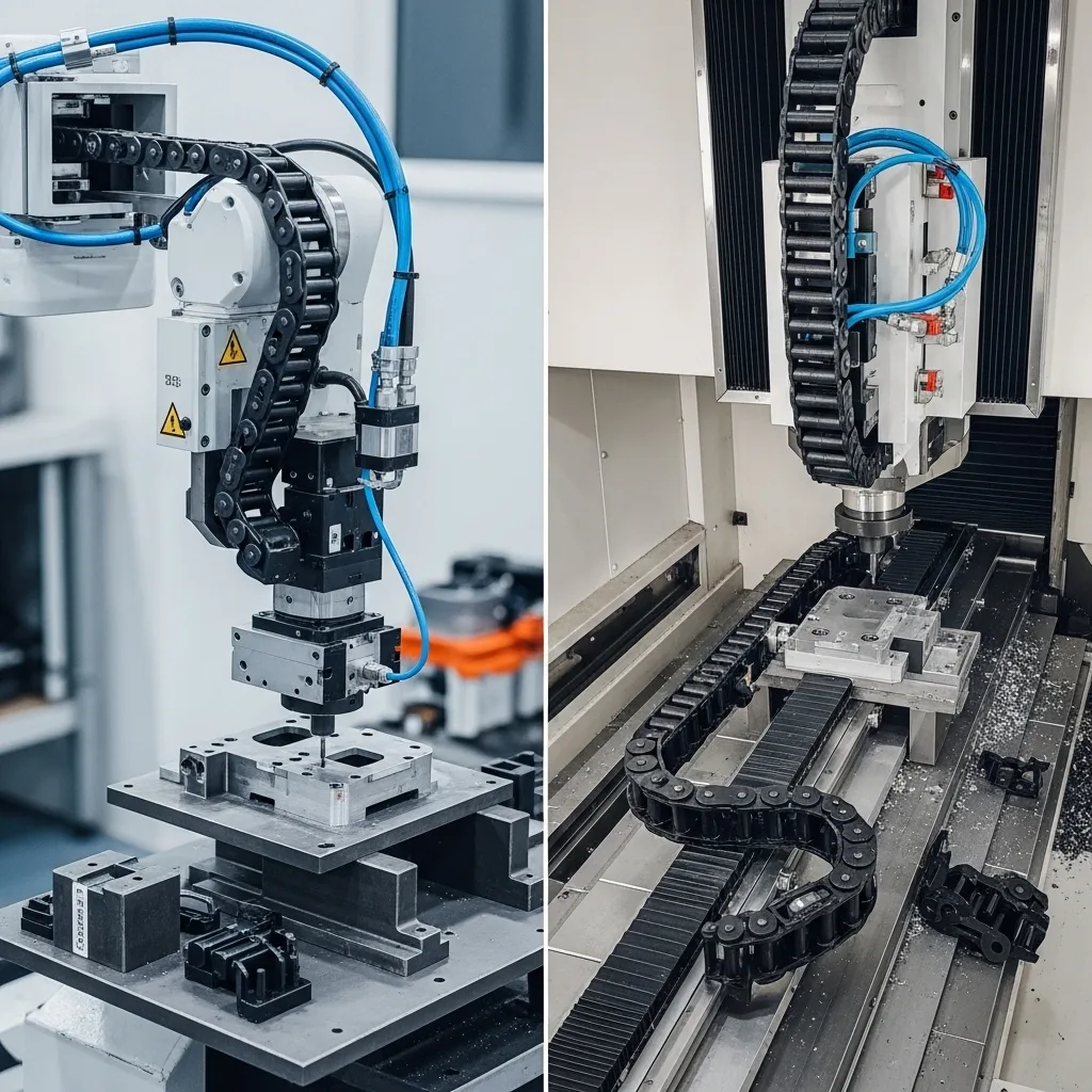 Xích nhựa luồn dây điện (Cable Guide Chain): Bảo vệ dây khỏi dầu công nghiệp, phoi kim loại, bụi và rung động.
