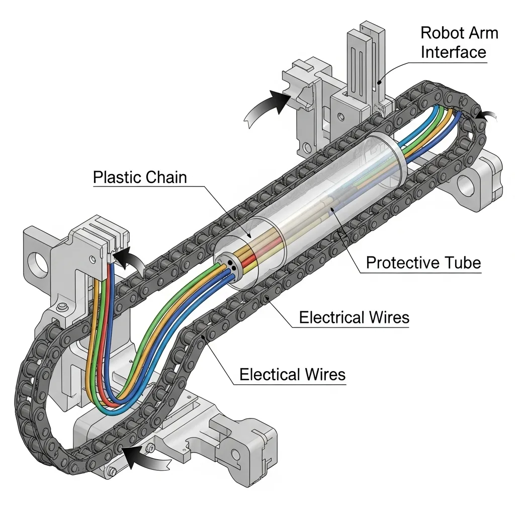 Sơ đồ hệ thống dẫn hướng dây tích hợp xích nhựa và ống bảo vệ trong robot công nghiệp
