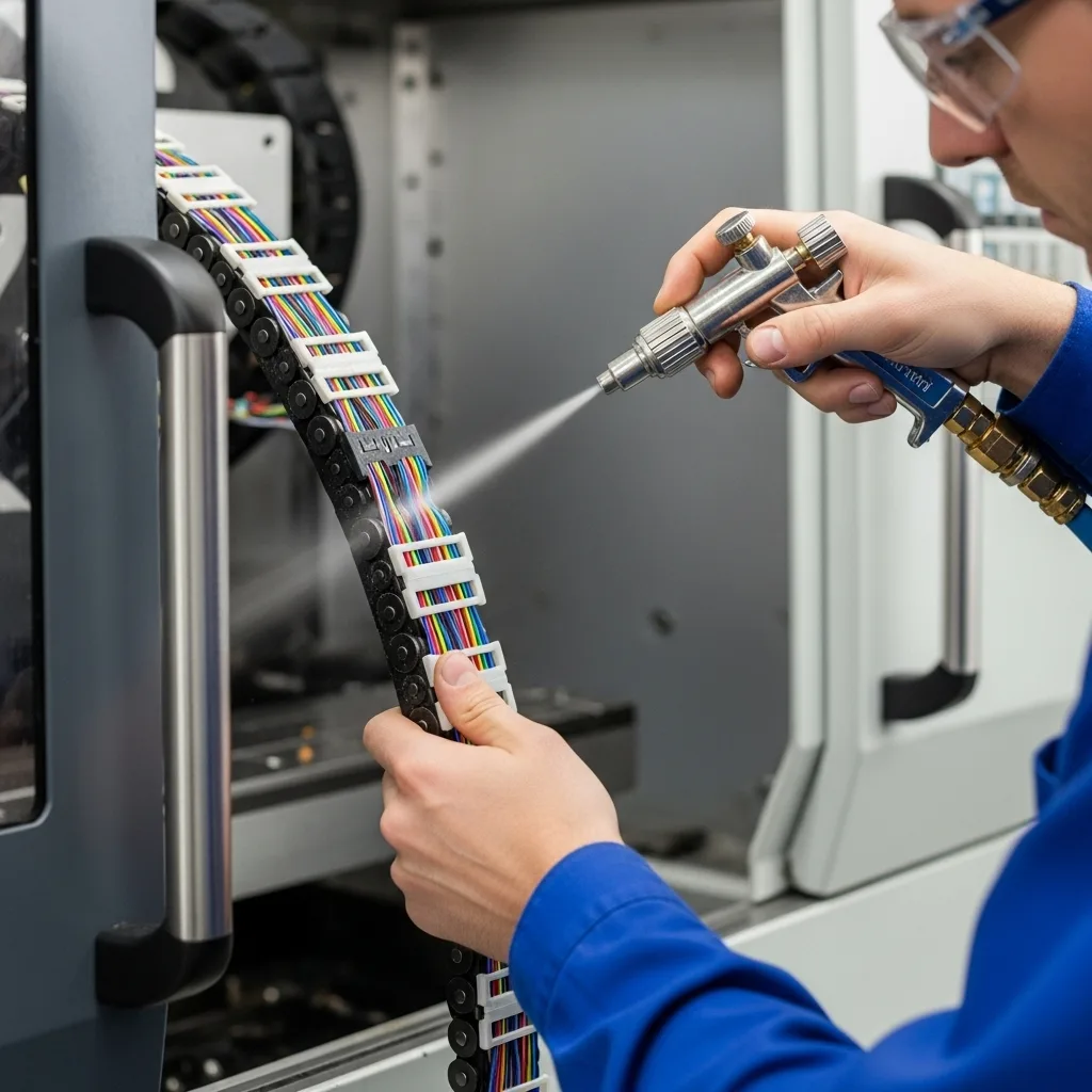 Làm sạch máng cáp, ống luồn và xích nhựa để tránh ma sát và mài mòn.