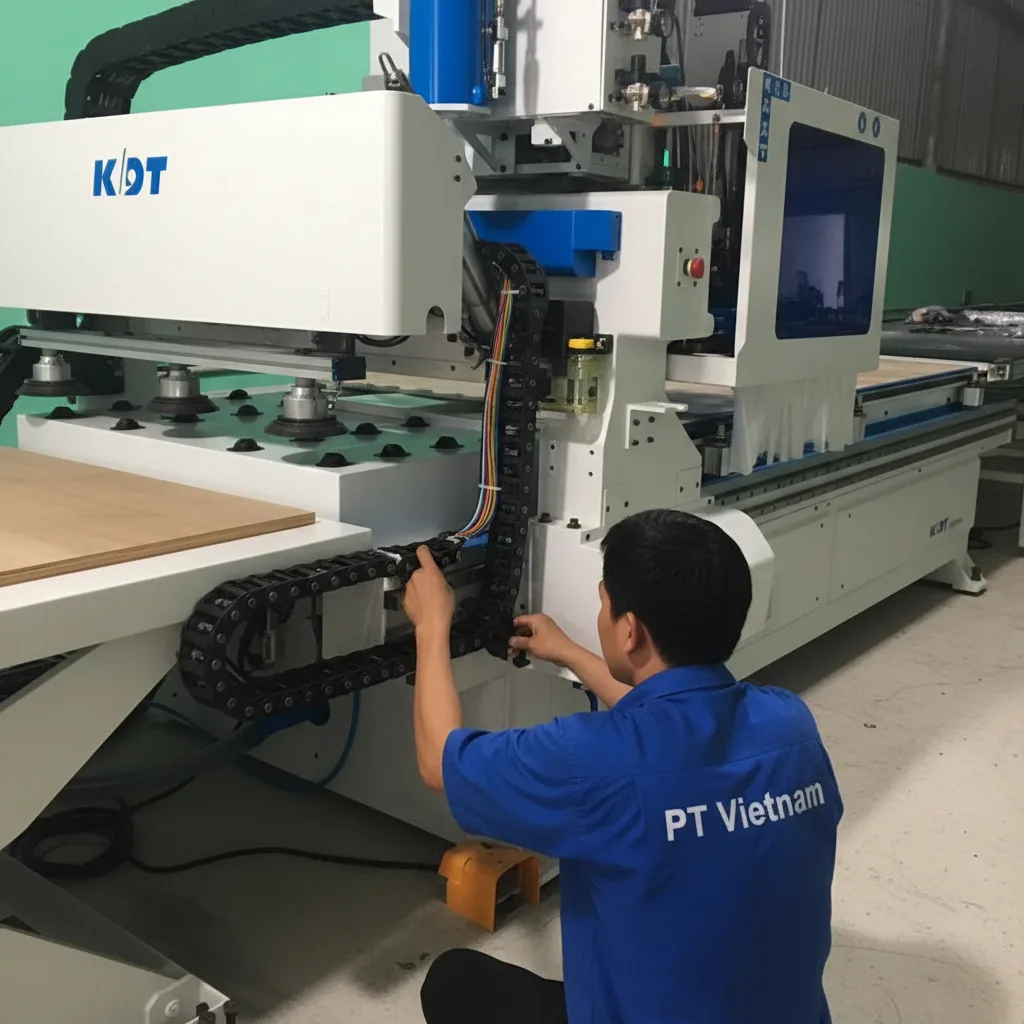 Hình ảnh minh họa: Kỹ sư PT Việt Nam kiểm tra hệ thống dây robot sử dụng xích nhựa cuốn cáp