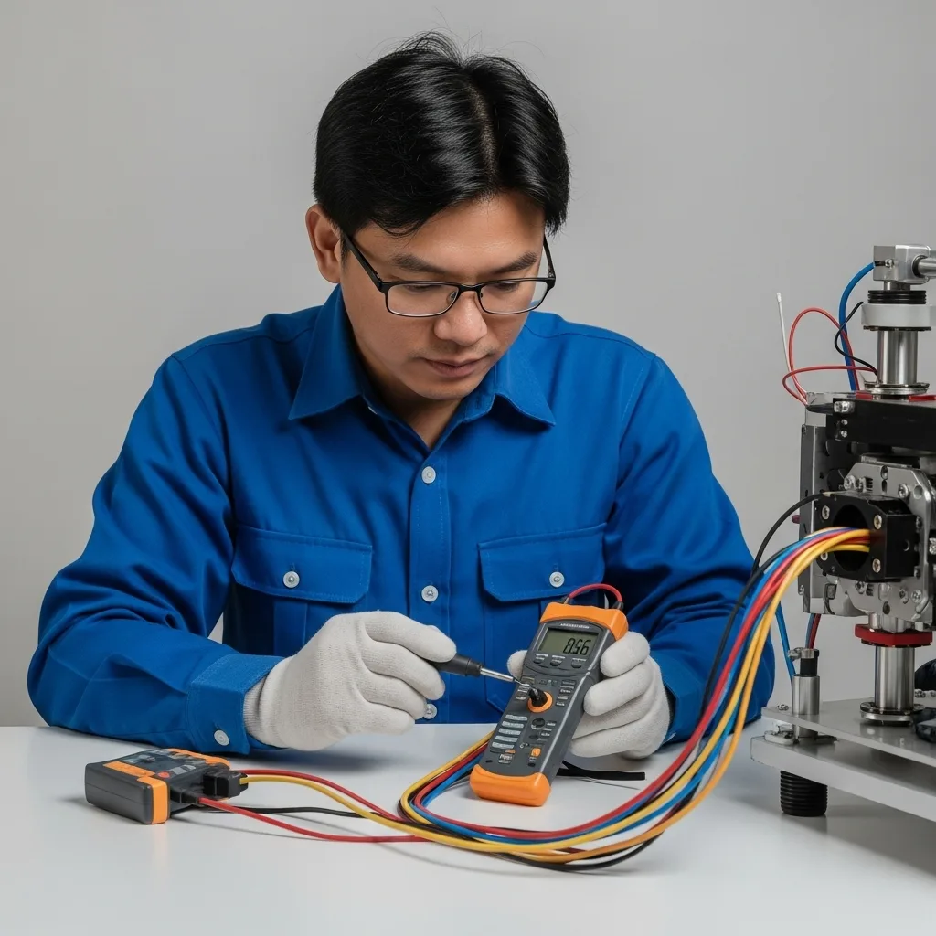 Hình ảnh minh họa: Kỹ sư đang kiểm tra dây robot bằng thiết bị đo điện trở cách điện