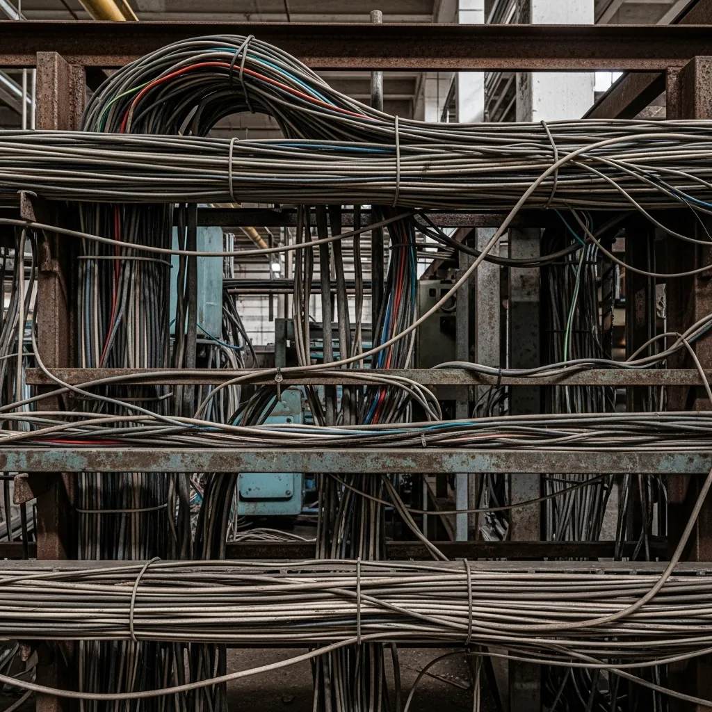 Hình ảnh một hệ thống dây dẫn công nghiệp lắp đặt lộn xộn, không có nhãn rõ ràng, tạo cảm giác rối rắm