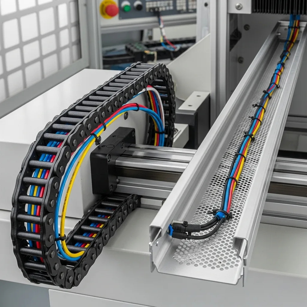 Các lựa chọn phổ biến hiện nay: xích nhựa dẫn hướng và máng cáp kim loại