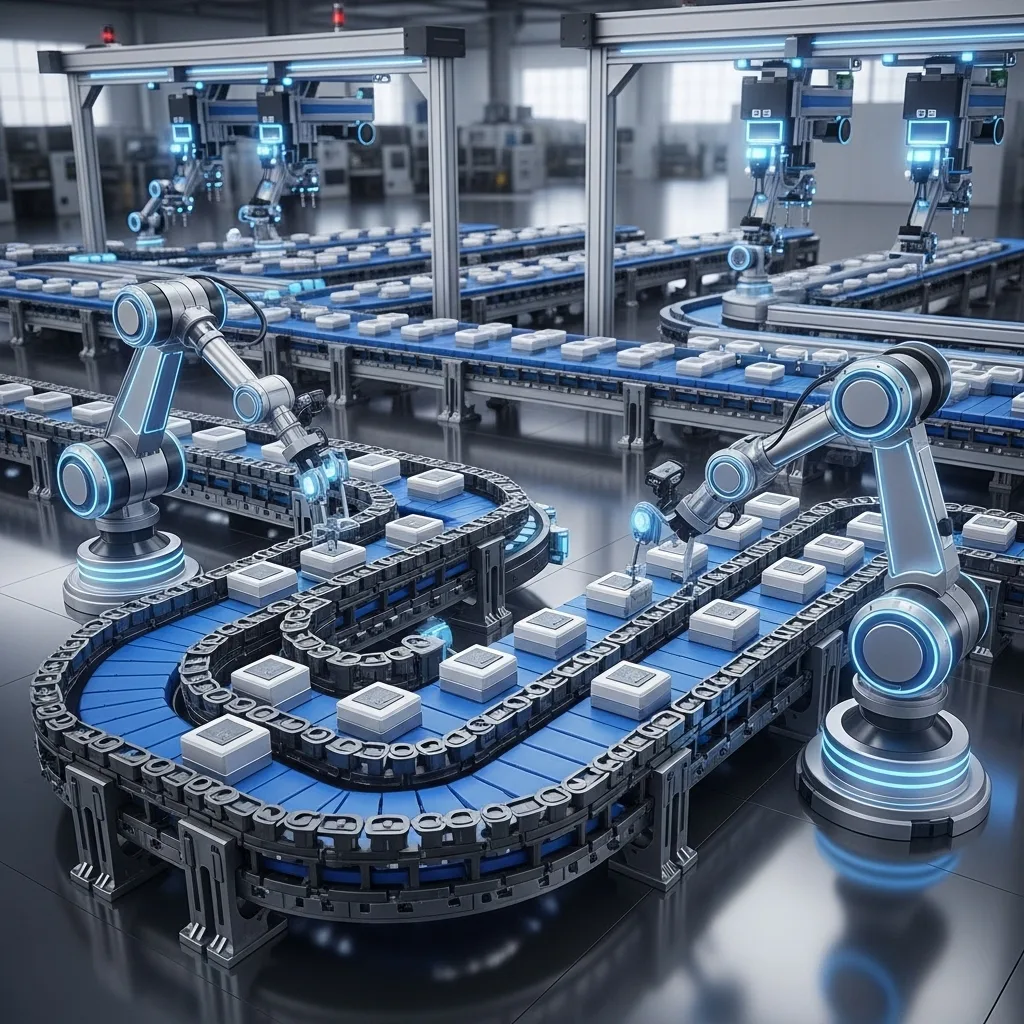 Nhà máy sản xuất linh kiện ô tô tại Bắc Ninh: Hệ thống robot hàn và vận chuyển được trang bị xích nhựa cuốn cáp và xích nhựa luồn dây điện giúp giảm 45% sự cố rò điện do rung động.